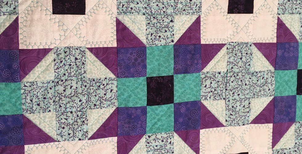 Searching for inspiration for a quilt for my Sister-in-Law's birthday, I found the pattern for this block titled "Sister's Choice". I linked 16 Sister's Choice blocks with a border that created 9 square-in-square blocks. All of these fabrics are more detailed and beautiful than the photographs show. It was important to me that this quilt be of very high quality, because it's recipient deserves nothing less! I used all of my newly acquired quilting skills, and even experimented with one of the many decorative stitches available on the Jenome 9400 (aka my magic machine). The fabric I had chosen for the back was slightly too small once I'd finished the top, so I added narrow strips of the green floral border that forms the wide border around the front.